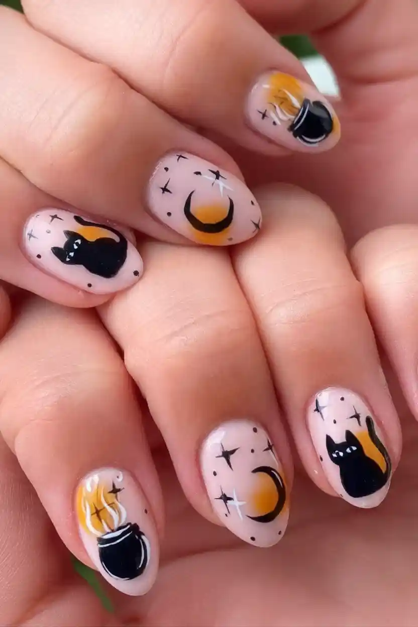 It is perfect for you in case you are the type of person who likes detail, hand-drawn art and a somewhat witchy look. It is simply stunning on shorter almond or round nails and it feels so on-trend in its softer tip of the Halloween 2025 ghastly side.
