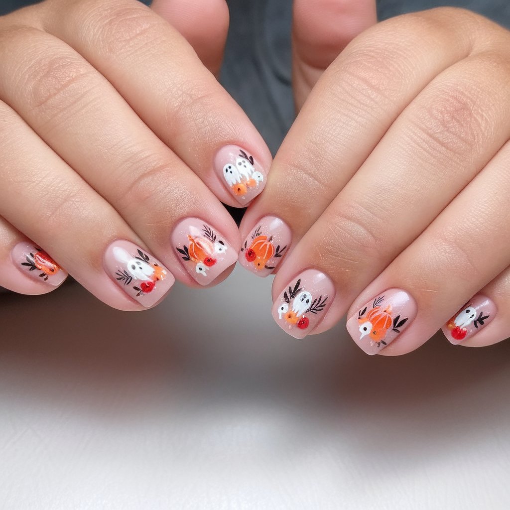 This would be fall manicure if fall had a manicure. This cheery piece is with soft ghosties, pumpkins, and dainty little leaves, such as one might walk through a harvest market as long as one has a drink of cider. It is sweet, lighthearted and spirit of orange and black.