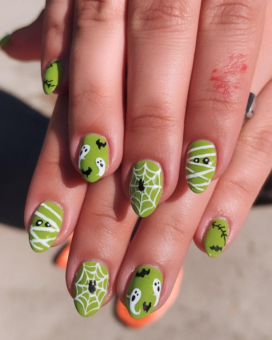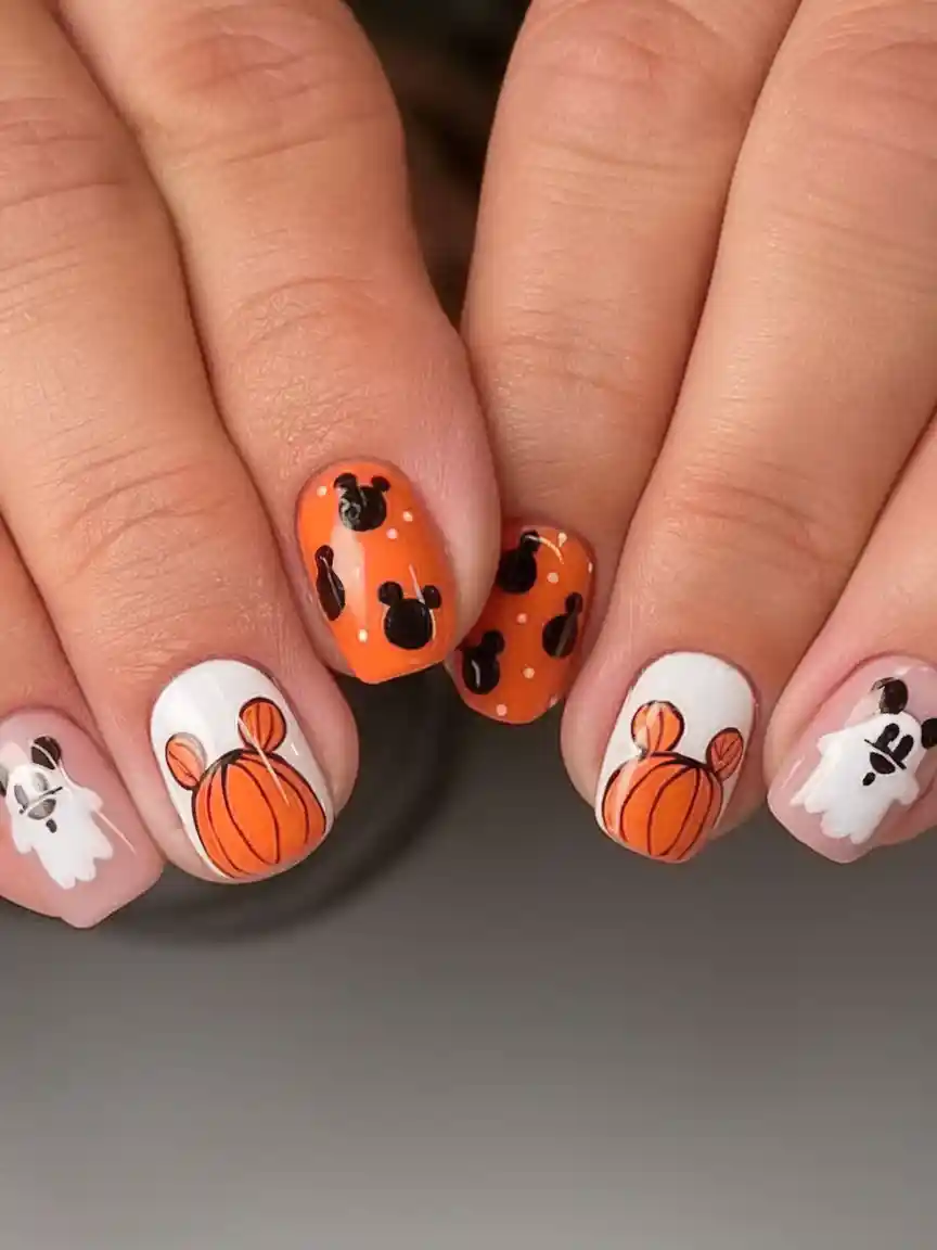 This is your Disney mom song and any other person who wants to enjoy the nostalgia of being a kid. The combination of bright colors and funny designs is best applied on short square nails and it fits being termed as one of the most wearable and cute Halloween look across all ages.