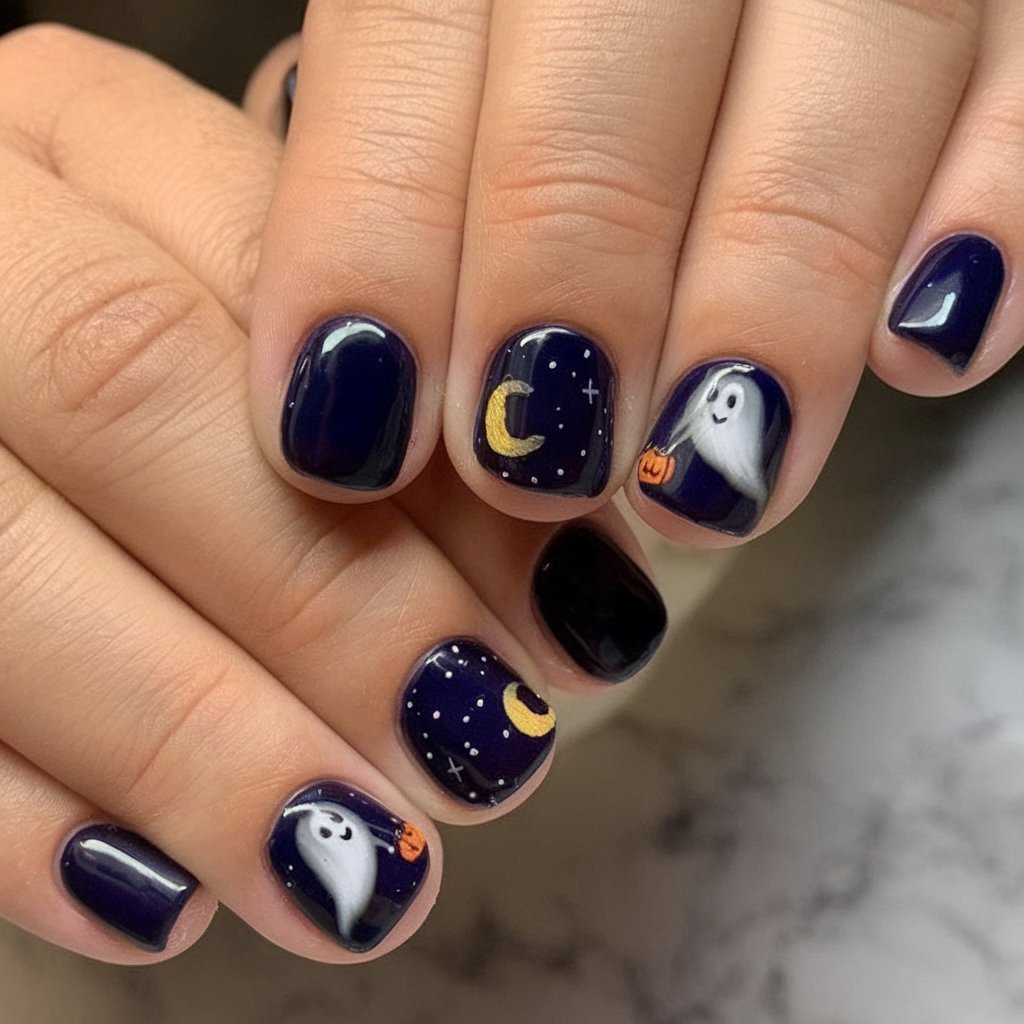 It is so dark, like the sky at night yet studded with the celestial products of gold, that this nail set adds the Halloween idea of ghost and gives it a dreamy effect. The troops of small spirits surrounded by pumpkins are too cute to be frightened and the shining stars create a mystical finishing touch.