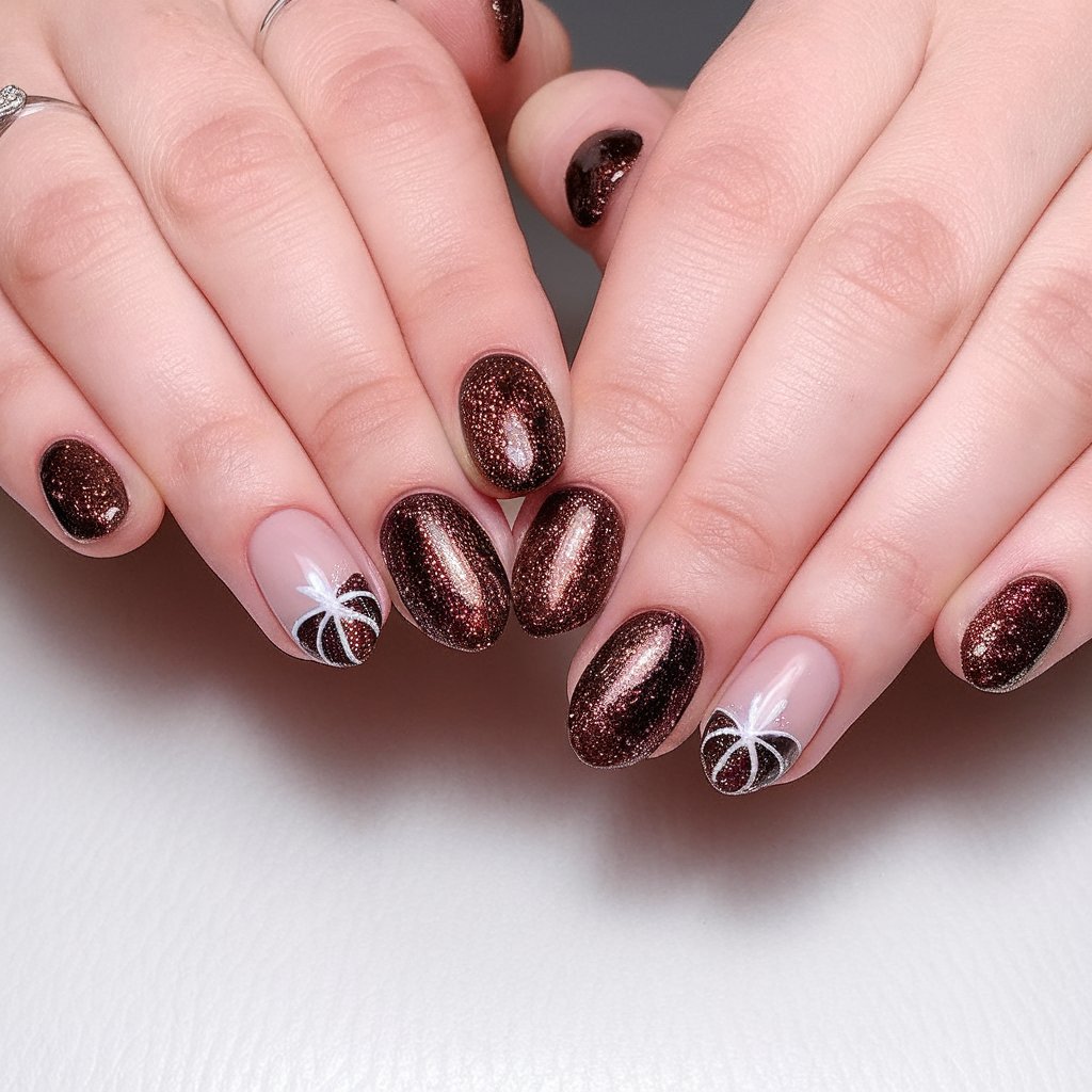 These nails reflect in deep cinnamon color like fall leaves catching the sunlight, and two cute little white-framed pumpkins are on the fringe. The design is more autumn romance than horror, soft, glowing and beautiful.