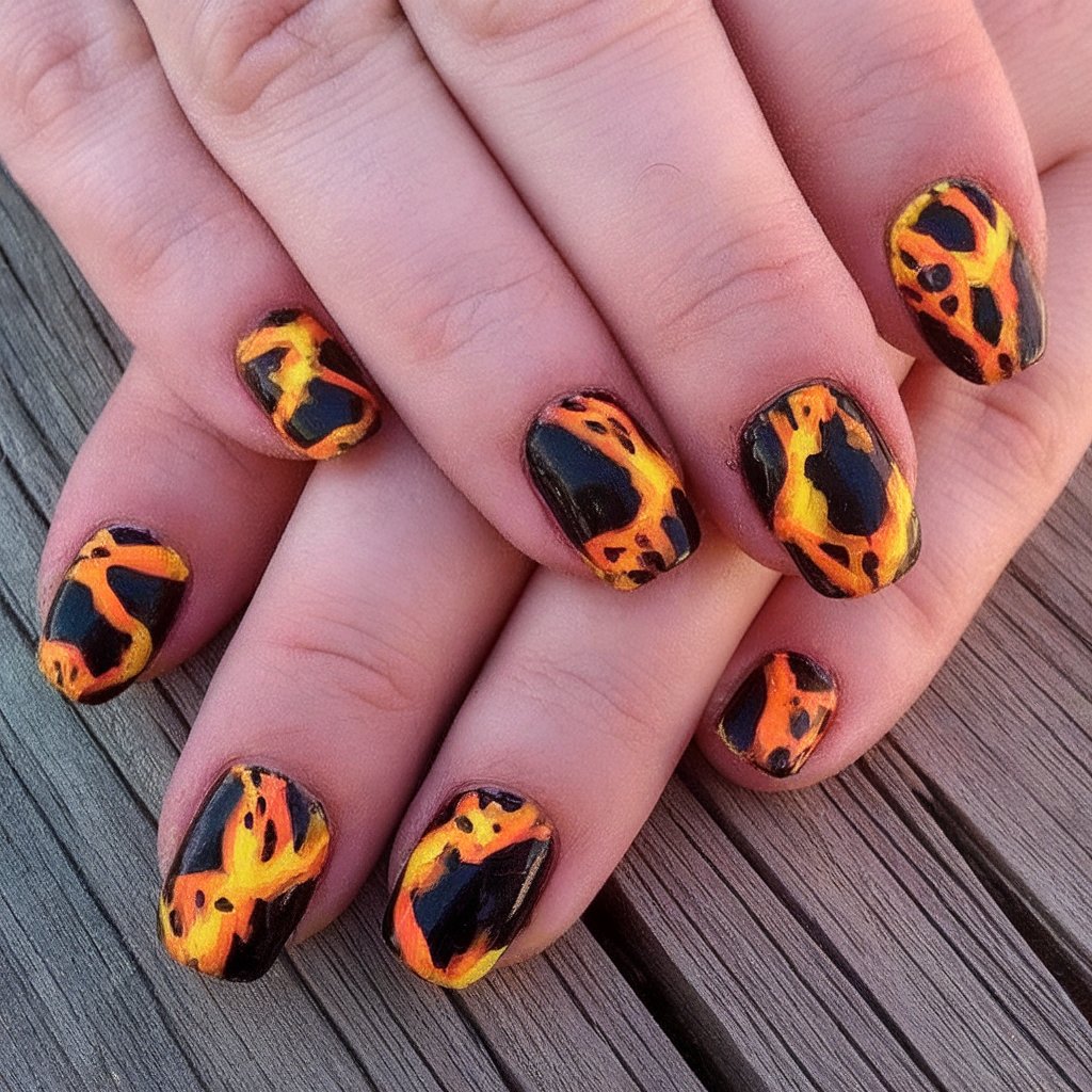 It is the hot mixture of orange and black where your skin is bombarded with a volcano. It is dark, gothic and everything but a typical Halloween design. This has got an animalistic energy, but with an abstract turn.