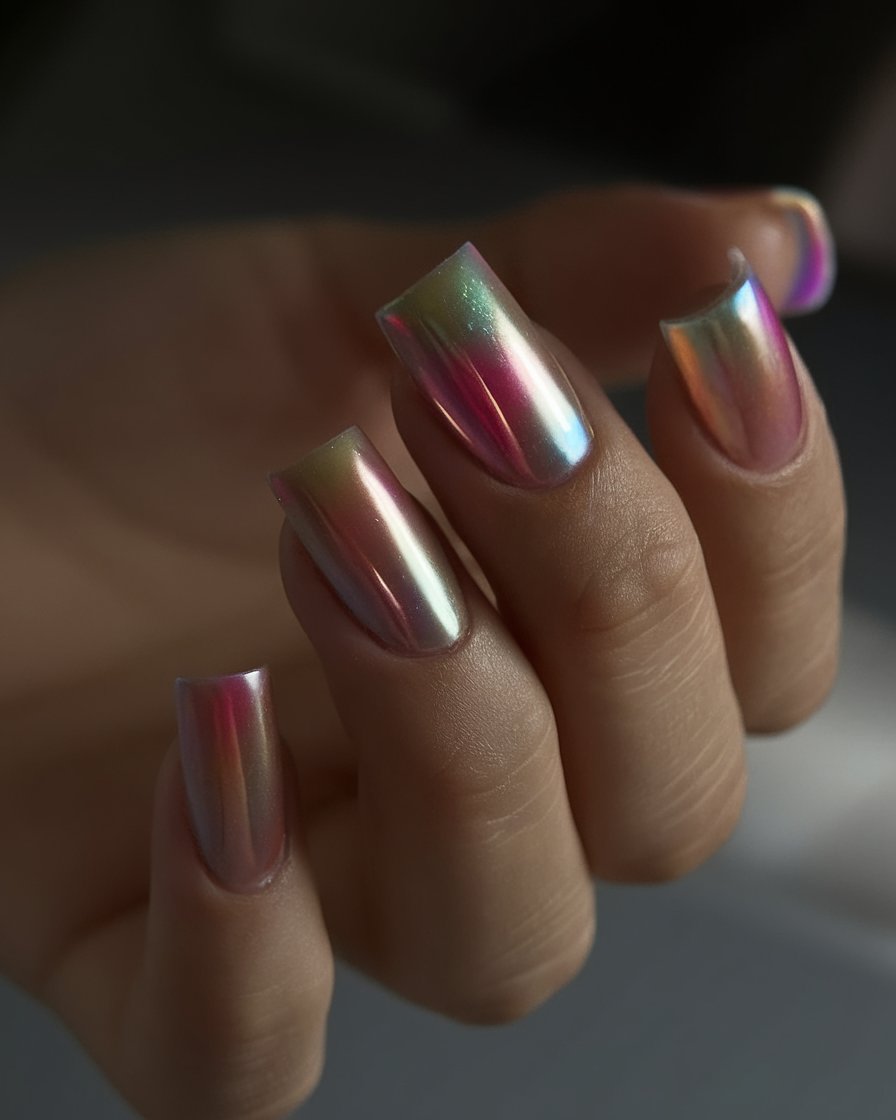 These nails are reflective in the way a rainbow preserves in a bubble of soap-like, but with a touch of futurism. This light seems to accentuate all the curves, changing lilac, seafoam and pink in a day dreamy chrome glaze. It is the type of finishing that would tell you that you are luxury without uttering.