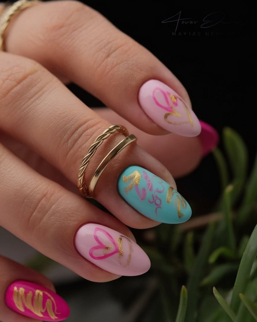 Ideal to almond nails, particularly when you need to get a bit of color in. These medium or short designs are ideal in the warmer months or when you want to have a special weekend. Put a pile of gold rings on to make the whole pop.