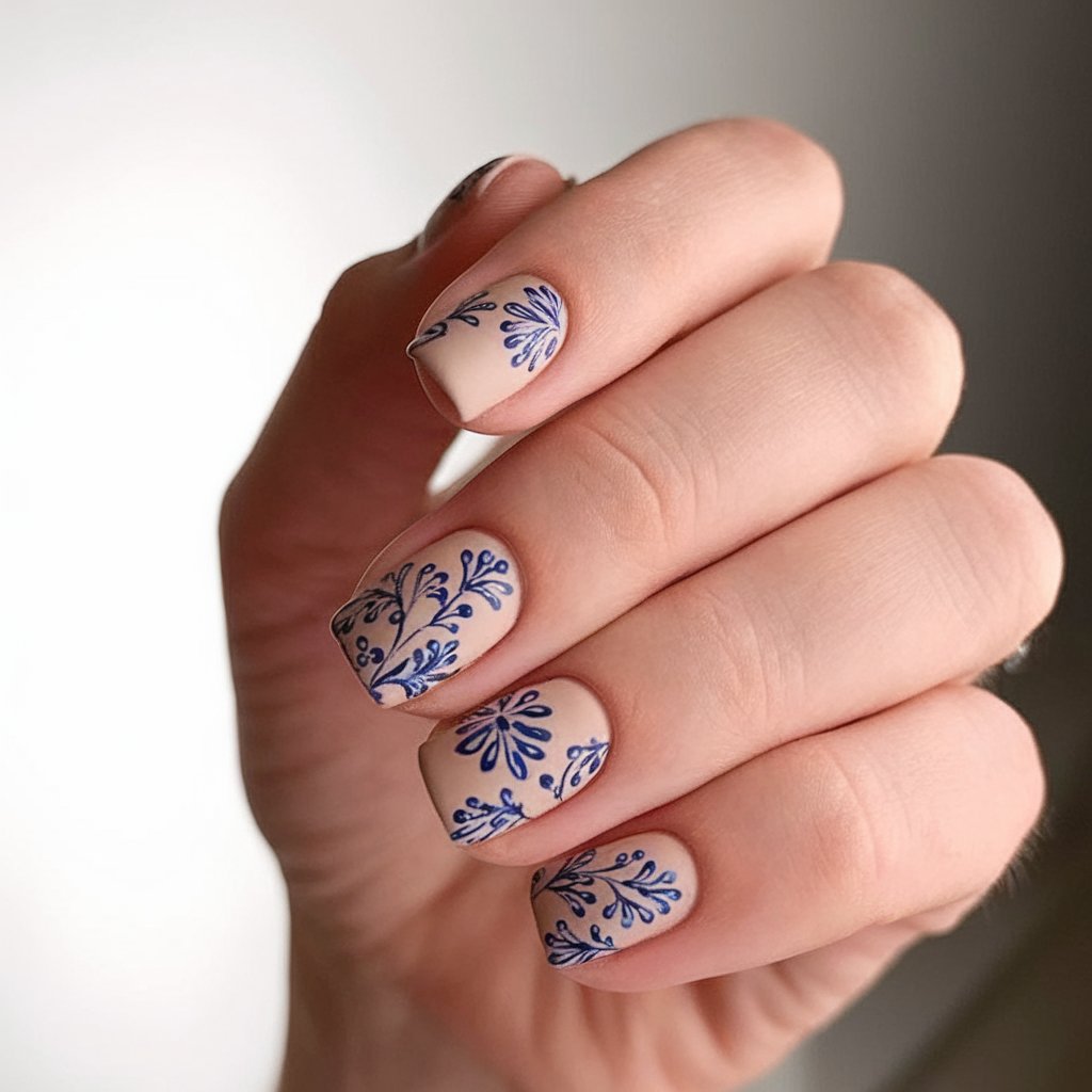 These nails are as a stroll through a porcelain garden. Its sophisticated blue floral art set against a matte nude background exudes serene, lightweight power, as though painted-tile floors or vintage embroidery in miniature-size nail polish.