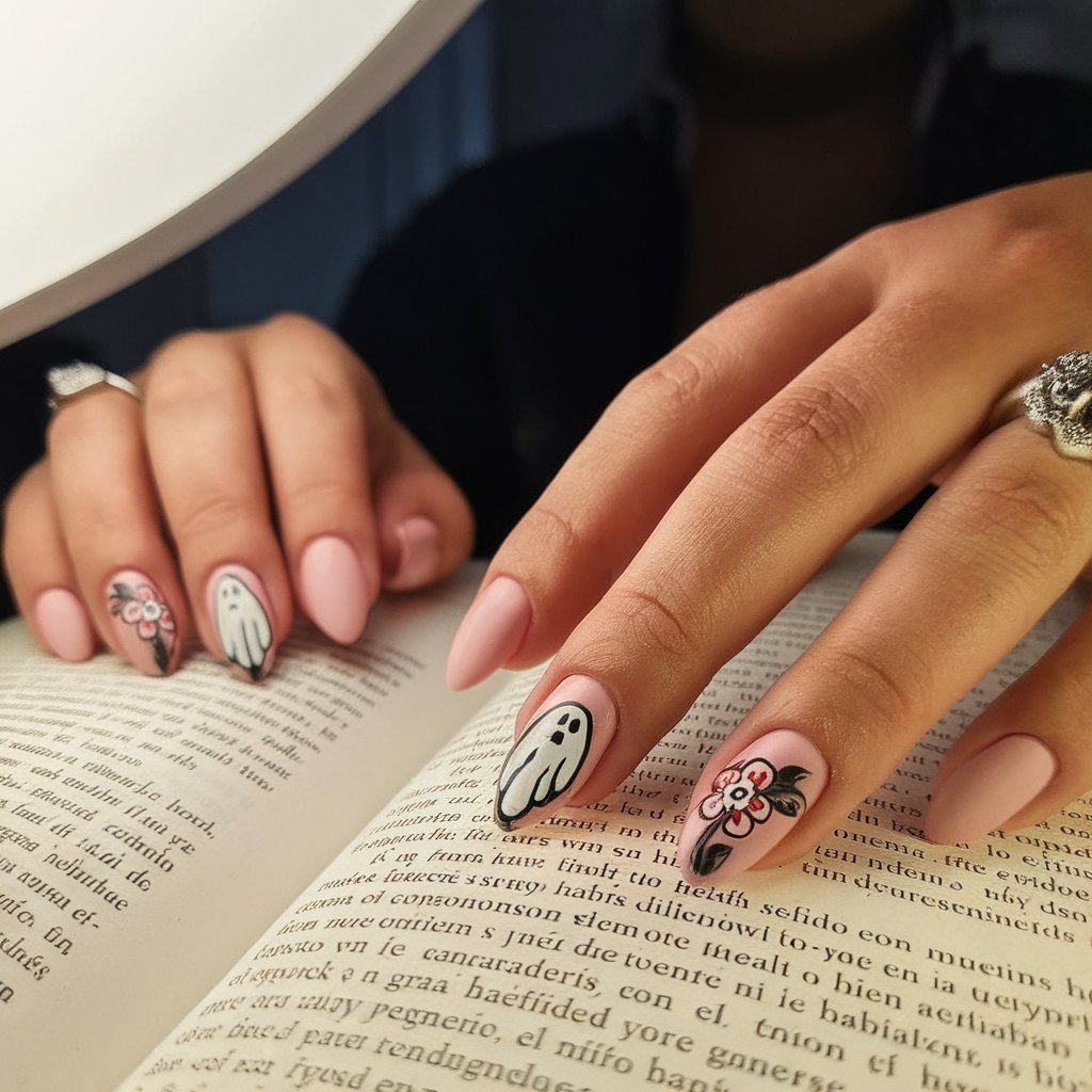 2. Matte Ghost & Floral Nails With a Soft Gothic Twist