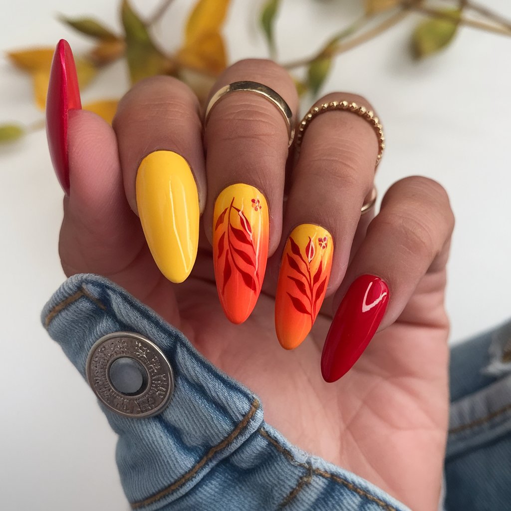 This nail art basically sums up the essence of fall including golden sunlight and red leaves and pumpkin spice everything. The yellow to orange gradient and the art of leaves reminds you of the crunchy trail in the forest you walk in with the most comfortable oversized scarf. Cozy, fun, and absolutely seasonal.