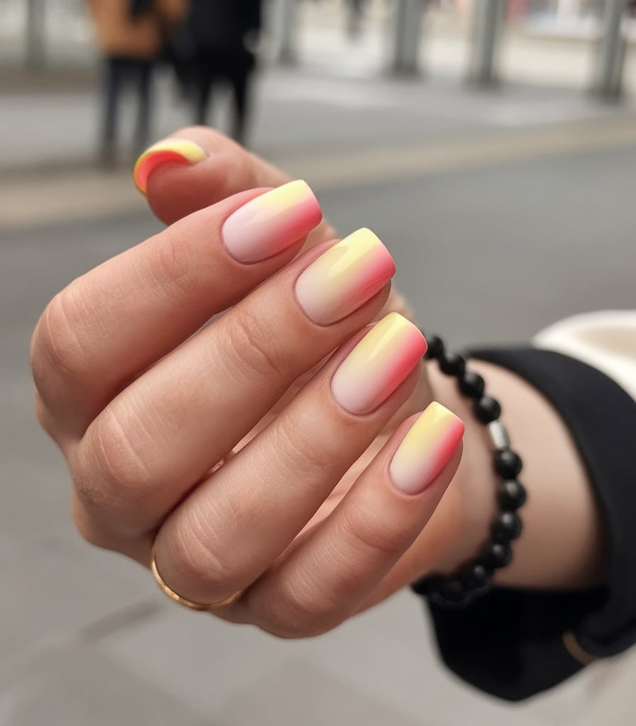 This creamy, pastel yellow, peach and blush pink combination is like a popsicle on the boardwalk in summertime-light, sugary, too pretty to miss. The fluffy ombre creates this sense of movement and the shiny finish is the attractive hint of sparkle to give the compliment.