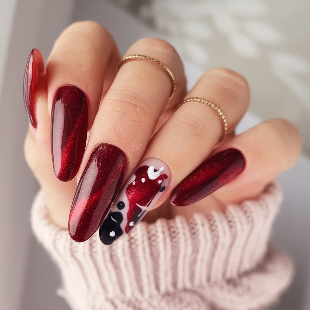 This is the best on almond nails when you desire the dramatic yet restrained color. The red matte is a good foundation, whereas the art drawing accent nail is what inspires you on the inside as an artist. An intelligent option to fulfill the desires of women who just want to get a taste of the surprise.