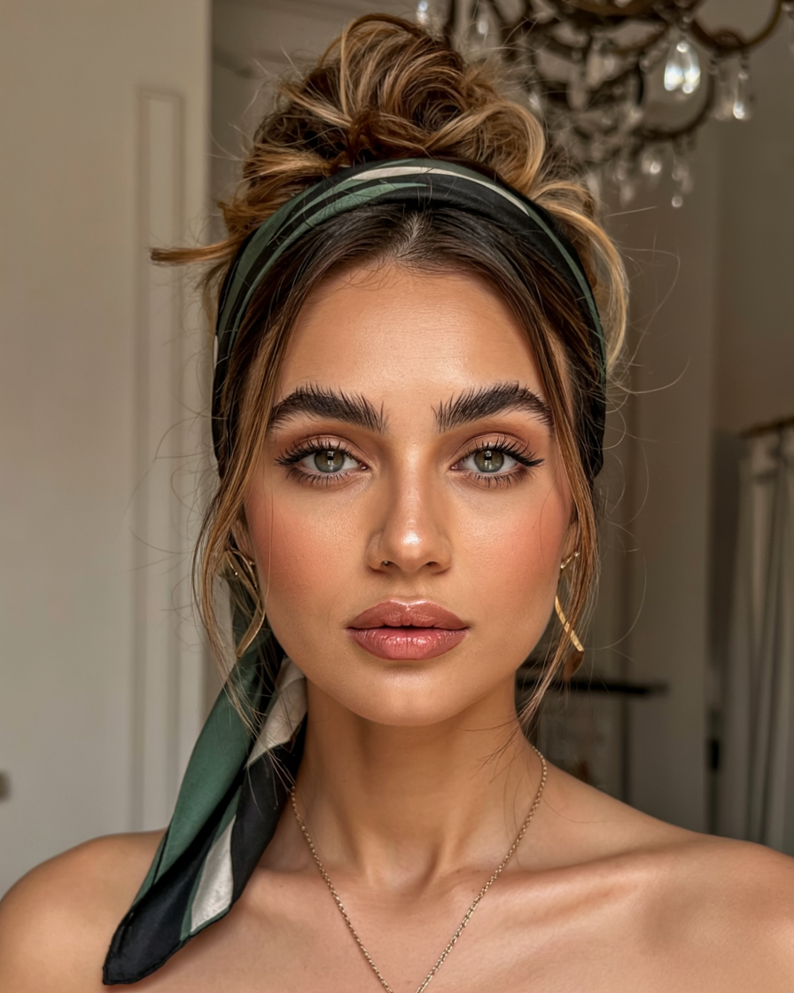The attitude here is effortlessly boho with a city edge. It’s perfect if you love hair up but don’t want a stiff, formal updo. The scarf works on curly hair, wavy textures, and even straight hair with a bit of grit added from dry shampoo. Throw it on with a breezy dress, sunglasses, and layered necklaces, and you suddenly look like you planned your whole day around golden-hour drinks—even if you’re just running to the grocery store first.
