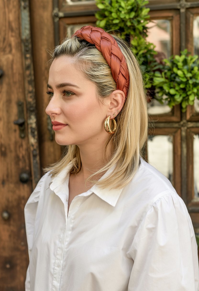 If you love a little whimsy, this boho headband with tiny braids feels like vacation energy you can wear on a Tuesday. The smooth band anchors the style, while slim pieces with braids fall on either side, giving subtle boho braid detail without committing to a full woven look. It’s soft, feminine, and just edgy enough to feel new for 2026, especially paired with simple makeup and hoop earrings.