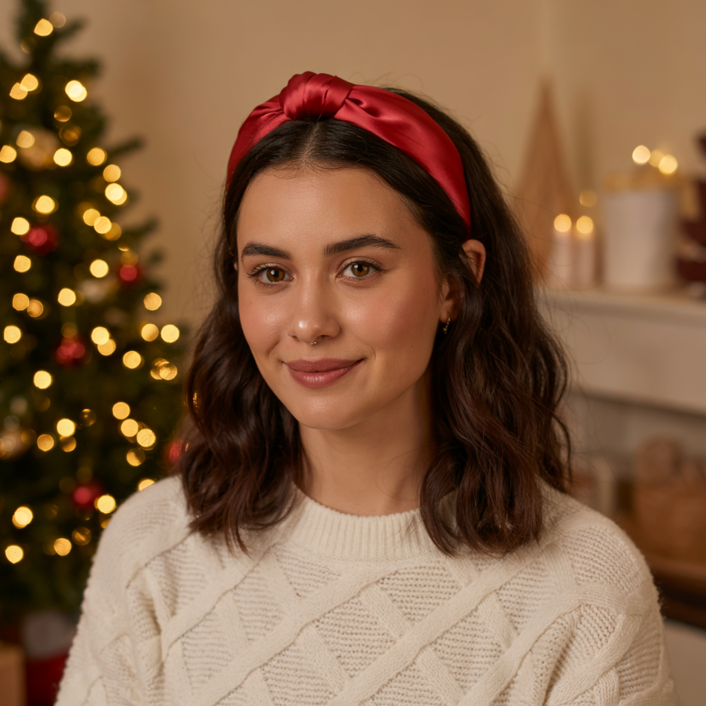 This red satin headband is like swiping on a bold lipstick—suddenly you look pulled together, even if you’re just in a cozy sweater. The shine of the fabric catches the light and instantly warms up the face, while the soft shoulder-length waves keep everything approachable and cute. It’s the kind of look that feels festive without trying too hard, perfect for impromptu dinners or holiday drinks at home.