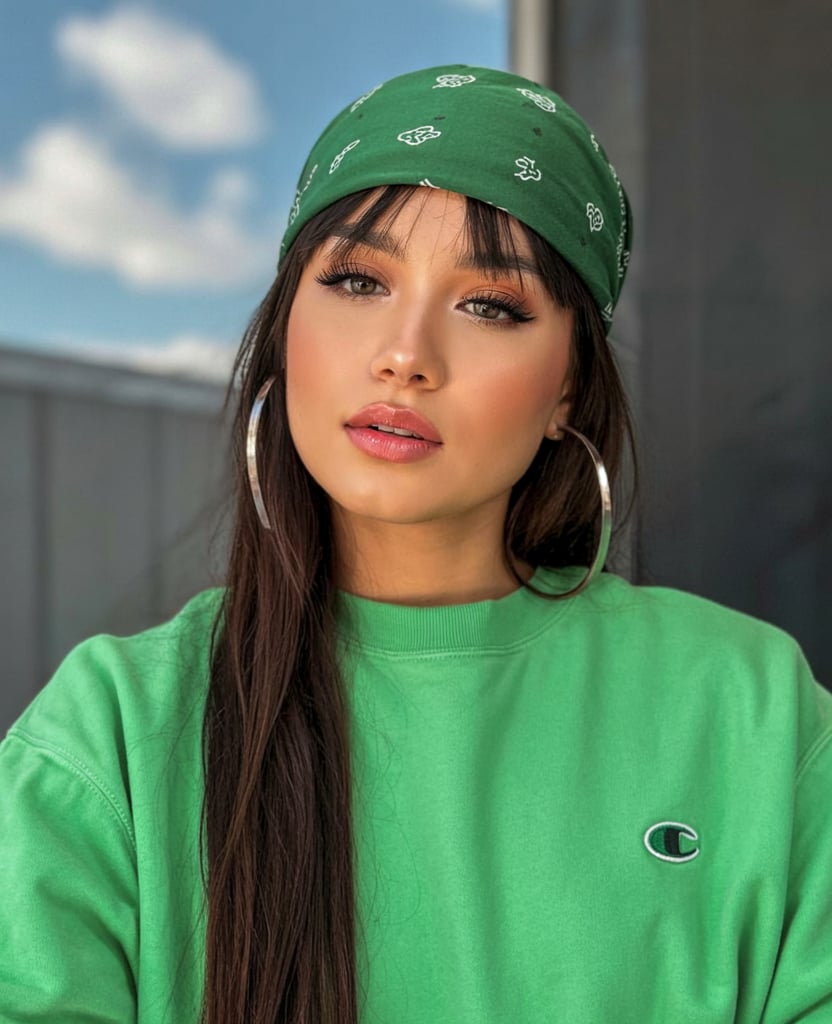 This green bandana-style wrap and long, silky lengths feel like a love letter to laid-back days. The fringe of bangs softens the face and highlights the eyes, while the straight, glossy hair falling underneath keeps everything sleek. It’s casual, a little flirty, and perfect for those mornings when you want to look intentional without putting in an hour of effort.