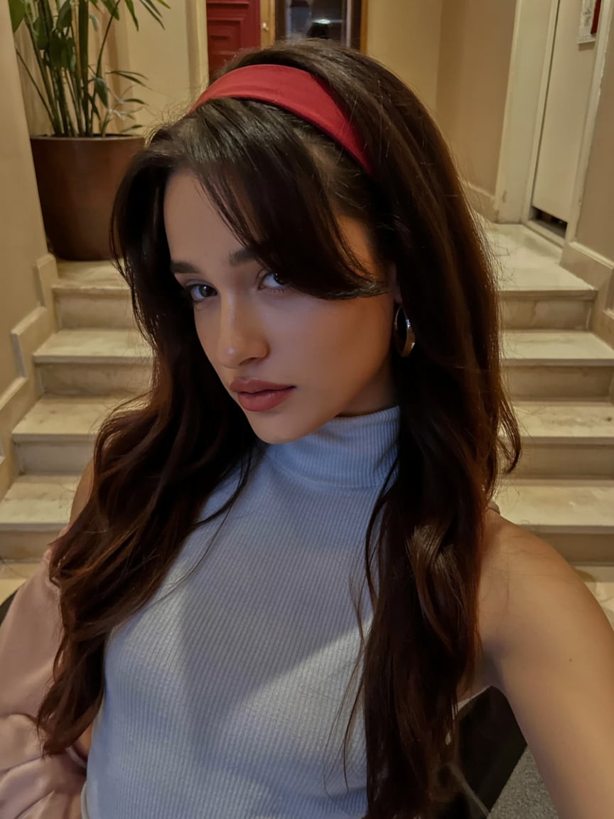 A soft blue headband against dark waves feels like that cozy Sunday when you finally slow down. The color brightens the eyes and makes the loose texture look even more romantic, while the subtle bangs skim the lashes just enough to add mystery. It’s dreamy without being precious, the kind of style you absentmindedly twirl while you sip coffee and plan your week.