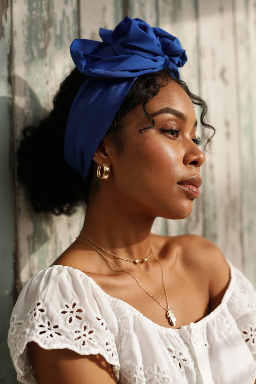 This bold blue scarf-style headband is pure joy wrapped around the crown. The oversized bow draws the eye upward, while soft, defined curls frame the face, giving a glow that feels like sunshine even indoors. On Black women, this rich shade makes melanin absolutely sing, turning a simple hair moment into a full-on statement without sacrificing comfort or ease.