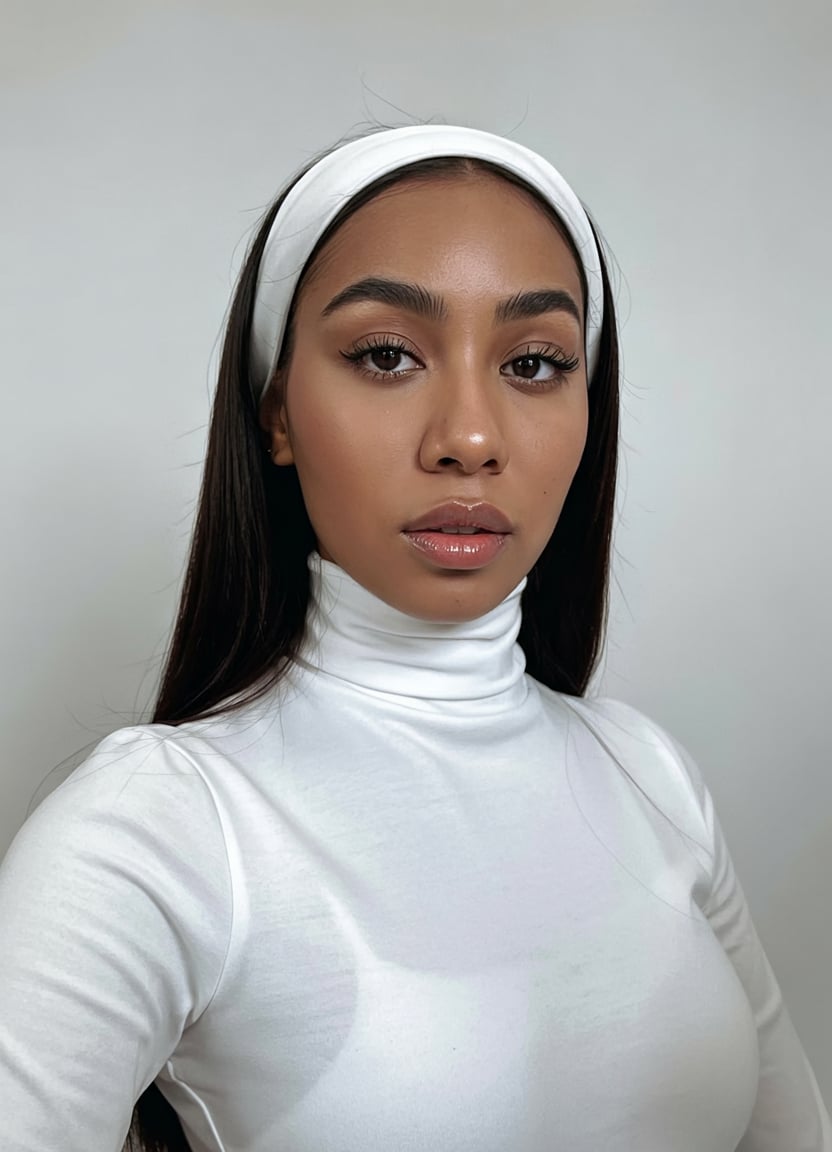 This crisp white headband with ultra-sleek lengths has that clean, modern calm we’re all craving lately. Everything about it whispers confidence: the high turtleneck, the glossy straight hair, and the smooth band framing the face. It’s minimal in the best way, making your features the focus and giving serious “I know exactly who I am” energy without a single curl in sight.