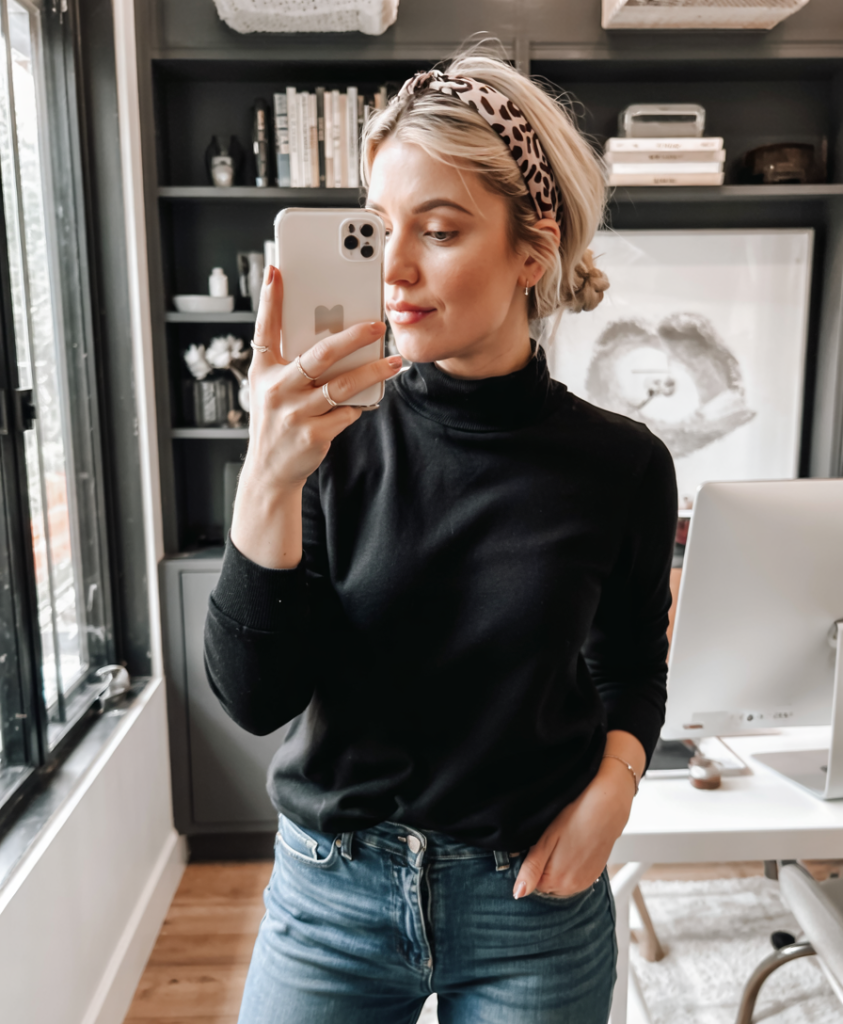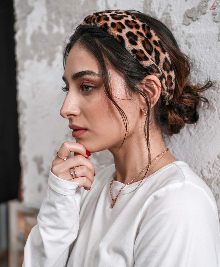 If you’ve been waiting for a sign to play with an updo, this is it. The headband makes any quick twist or pinned bun instantly look intentional, even on slightly frizzy or day-two hair. It’s a flattering option for most face shapes and hair types, from fine straight hair to soft curly hair, because the volume is focused low and the headband keeps the top smooth. Throw on a simple outfit and delicate jewelry, and let the leopard print be your little burst of confidence.