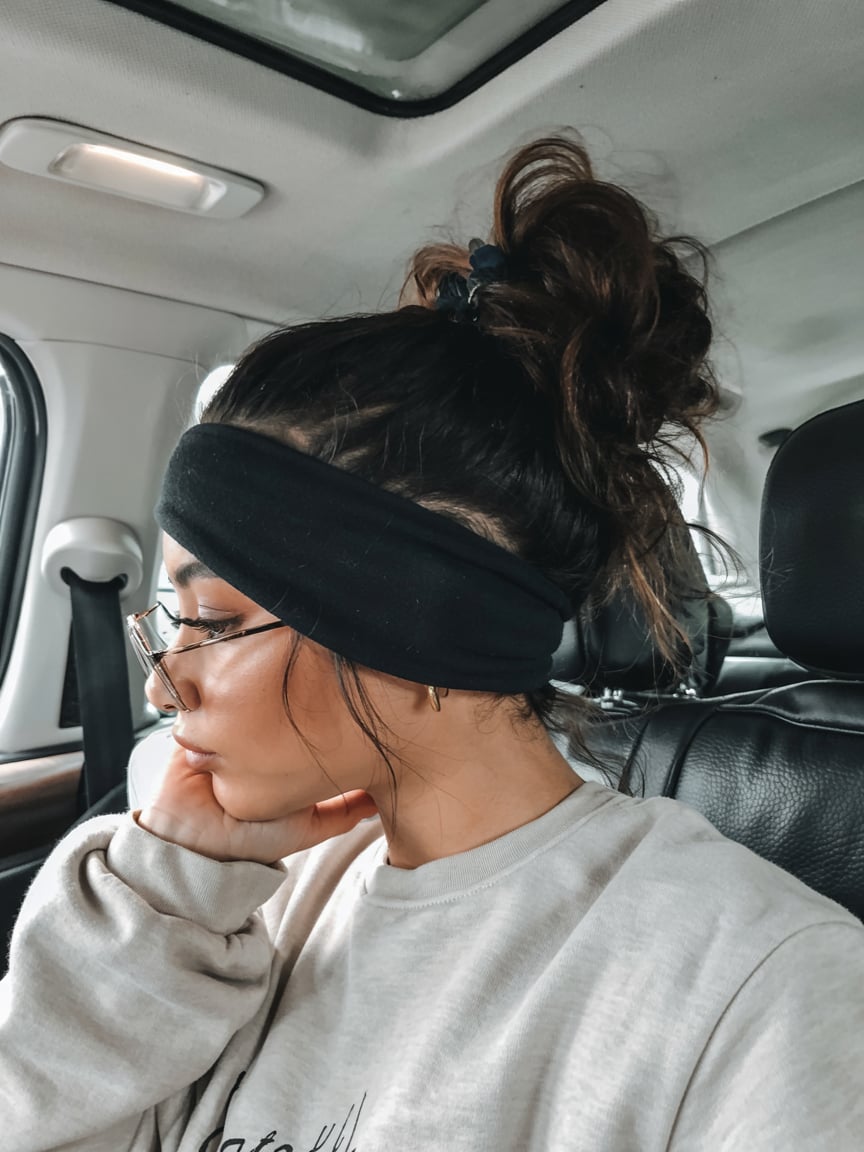 This soft, slouchy messy bun and black headband combo is the road-trip best friend you didn’t know you needed. The hair is twisted up and secured high, while the headband keeps everything snug and comfortable, even when you’re leaning back in the car seat. A few wisps fall around the face, giving that relaxed, thoughtful vibe we all slip into on long drives.