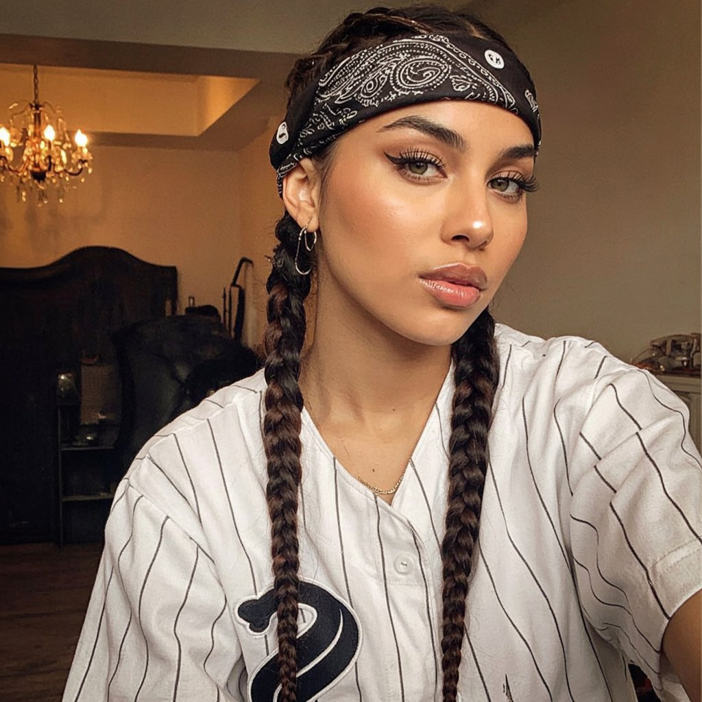 There’s no denying the attitude in a bandana wrapped across the hairline and two long braids trailing over your shoulders. It’s sporty, bold, and just a little rebellious, like the coolest girl on the team who always has a story to tell. The pattern frames the face while the braids keep everything neat, making this style feel as practical as it is striking.