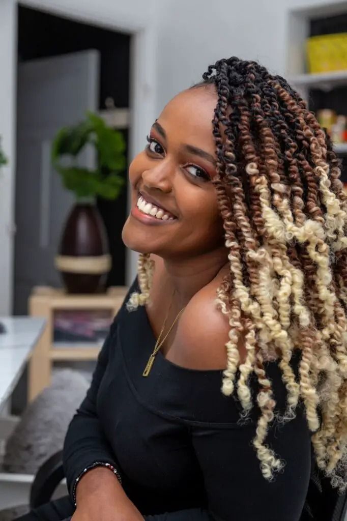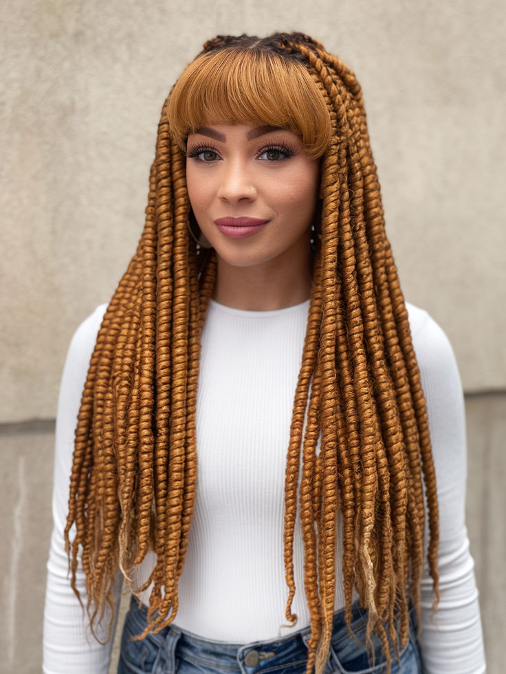 This stunning look combines medium-length spring twists with soft bangs for a face-framing effect. The golden tones add warmth, making it a great choice for women who want a fresh, vibrant style. To achieve this look, use crochet twists and section the hair evenly for a smooth finish. Perfect for casual brunches or evening outings, these twists pair beautifully with neutral outfits.