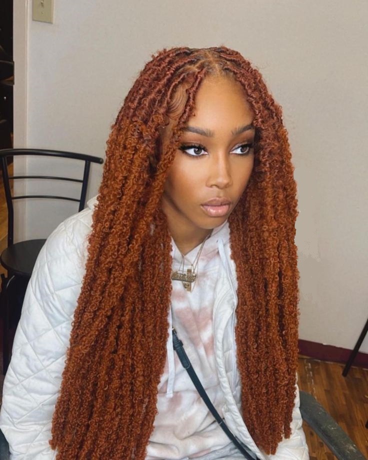 These copper-colored locs are enhanced with defined curls, adding a playful and stylish touch to the overall look. The warm tones make this hairstyle ideal for spring, while the defined curls add texture and dimension. Style with casual or formal outfits for an effortlessly chic look.