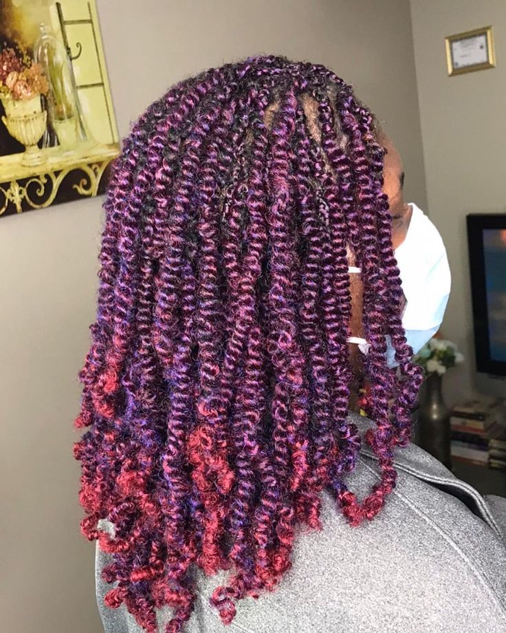 This vibrant style features a stunning mix of purple and red ombre tones, perfect for making a bold statement this spring. The medium-length twists offer versatility and can be styled in various ways, from a casual ponytail to a chic half-up look. Ideal for women who love experimenting with colors while keeping their natural hair healthy and stylish.