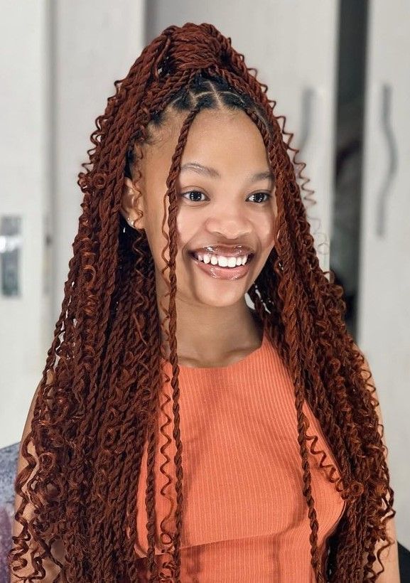 These beautiful auburn twists styled into a high ponytail create a fun and youthful look. The high ponytail adds volume and elegance, making it suitable for both everyday wear and special occasions. The warm auburn tones complement a variety of outfits, from casual dresses to formal attire.