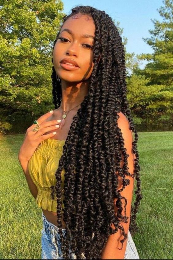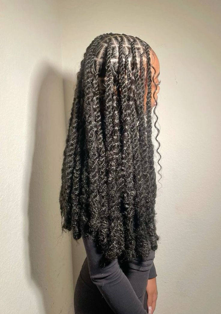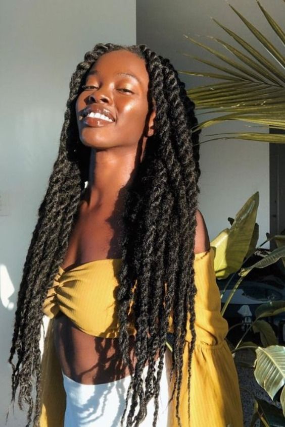These jumbo twists showcase the beauty of natural hair with their thick, defined structure. The minimalist style emphasizes the hair’s texture and volume, making it a perfect choice for women who want a bold yet low-maintenance look. Pair with statement earrings for a complete outfit.