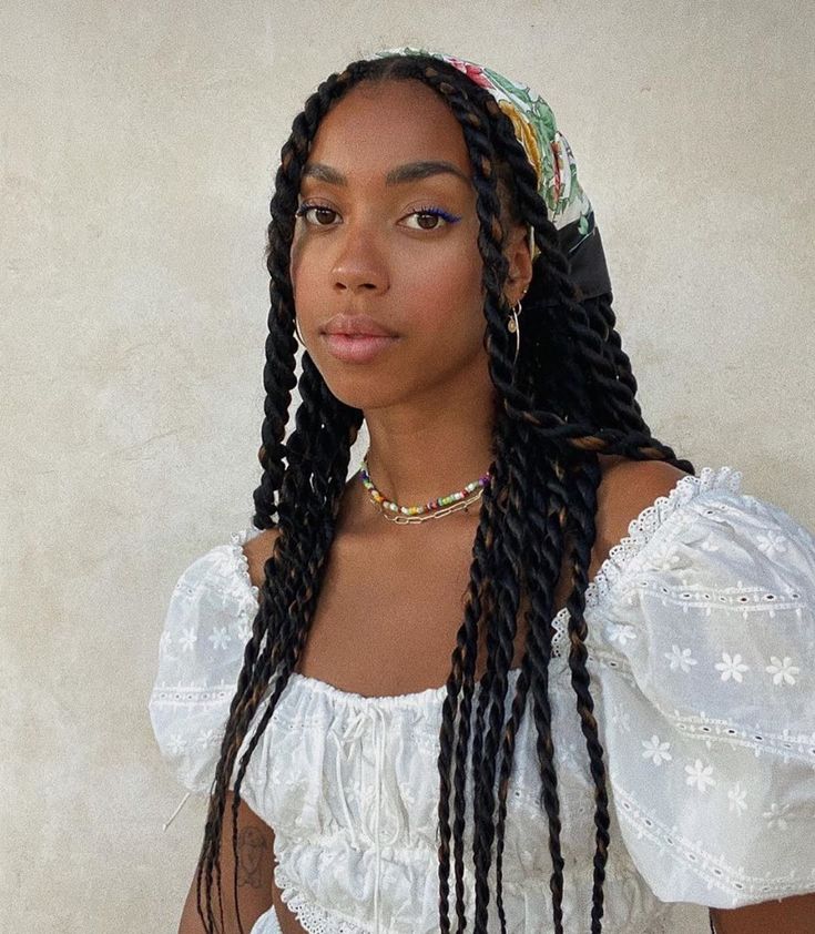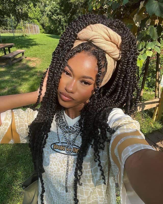 This chic hairstyle features medium twists with a colorful scarf tied as an accessory, offering a pop of color and personality. The scarf can be styled in various ways, allowing you to switch up the look effortlessly. This versatile style is ideal for brunches, picnics, or any spring outing.
