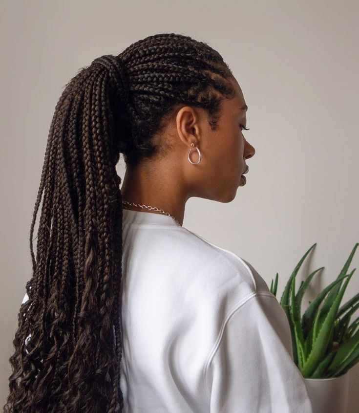 This sleek and polished ponytail with box braids is the epitome of elegance and practicality. The tightly braided base ensures a long-lasting style, while the ponytail offers versatility. Perfect for workwear or a night out, this hairstyle is both functional and fashionable.