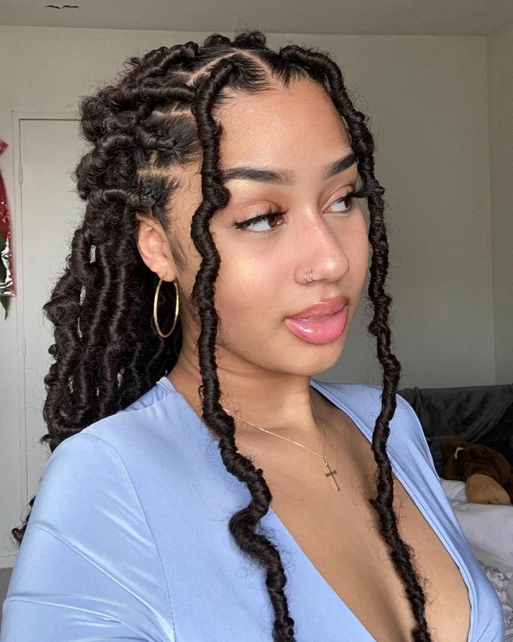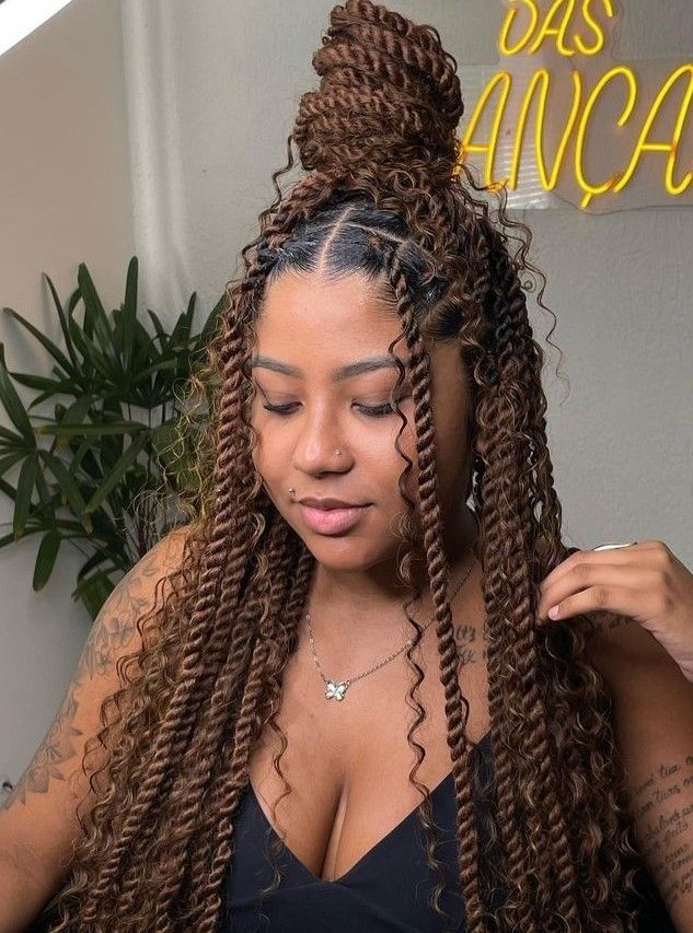 Ideal for those who love a mix of textures, this style combines long spring twists with loose curls for a dynamic, voluminous look. The curls soften the overall appearance and add a playful touch. Style with lightweight hair products to maintain bounce and shine. This hairstyle works perfectly for a chic dinner date or casual day out.