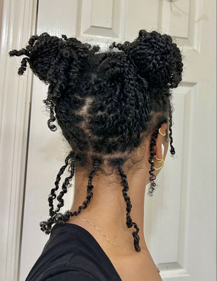 For those who love playful and youthful styles, try these adorable twin buns with small twists cascading down the back. This look is ideal for women with short or medium natural hair who want something fresh and manageable. Use a lightweight styling gel to keep the edges sleek and the buns secure.