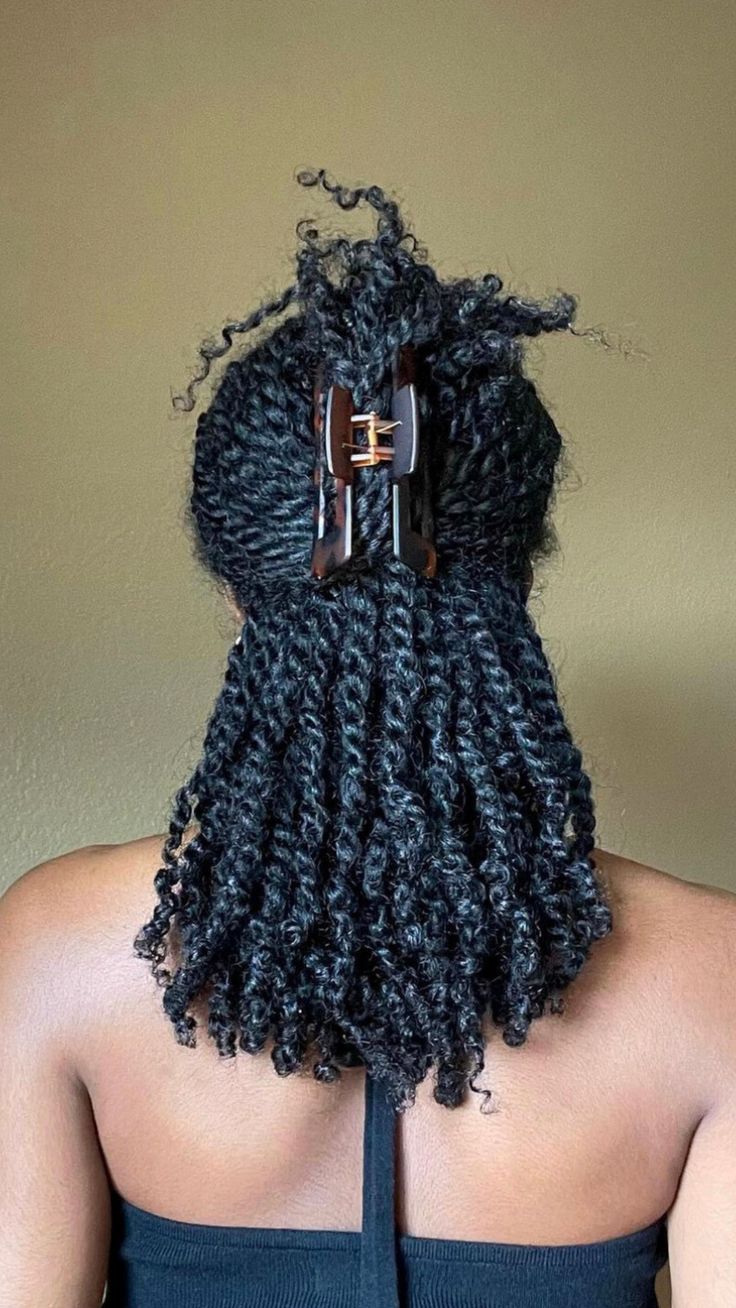 This trendy half-up style features spring twists secured with a claw clip. The twists fall naturally, creating a chic and effortless look. This hairstyle works for both casual and formal settings, making it versatile and practical. Pair with statement earrings for added elegance.