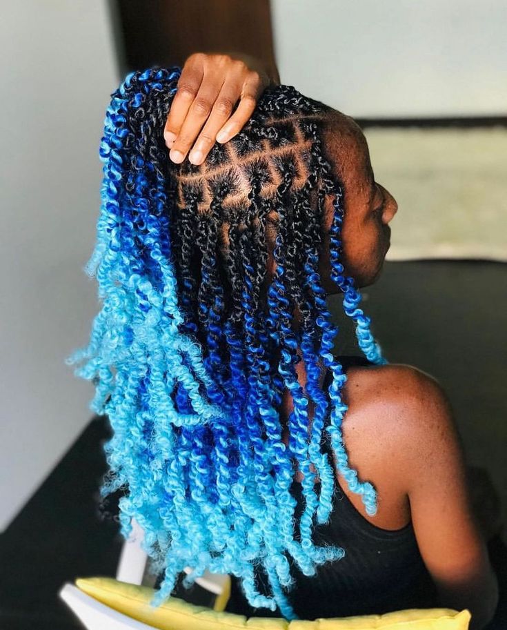 Add a pop of color with these bold ombre blue twists. Using crochet techniques, this style offers a striking transition from black to vibrant blue. Perfect for adventurous women who love experimenting with their hair, this look pairs well with minimalist outfits to let the twists shine.