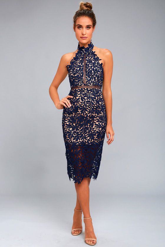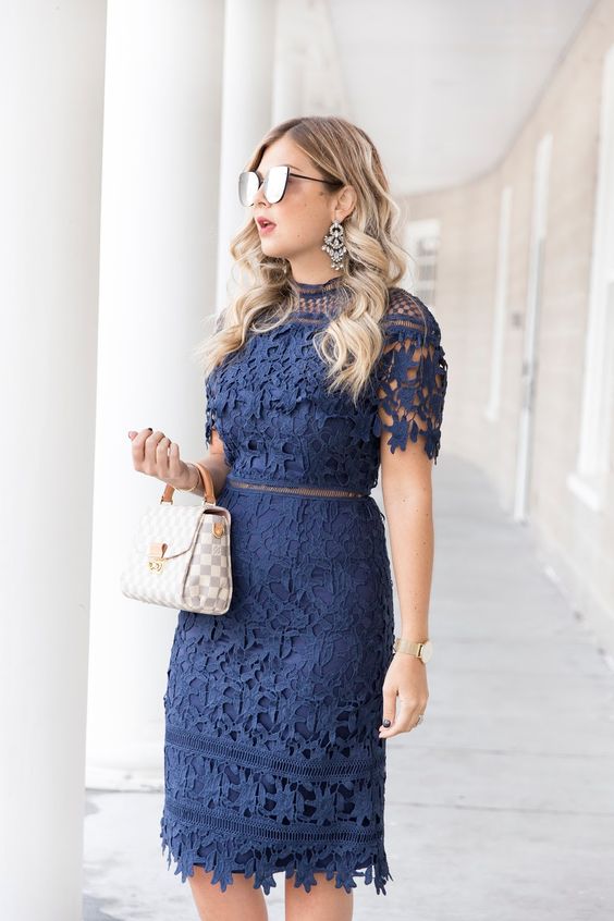 When it comes to lace dress outfit black, the sophistication level soars with a navy lace dress. Ideal for evening events, its high-neck and sleeveless design emphasize the shoulders, while the body-hugging silhouette showcases the figure. Pair it with beige or gold heels for a stunning night out.