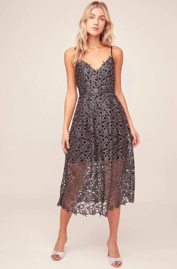 2. Elegant Evenings: The Charcoal Lace Midi Dress