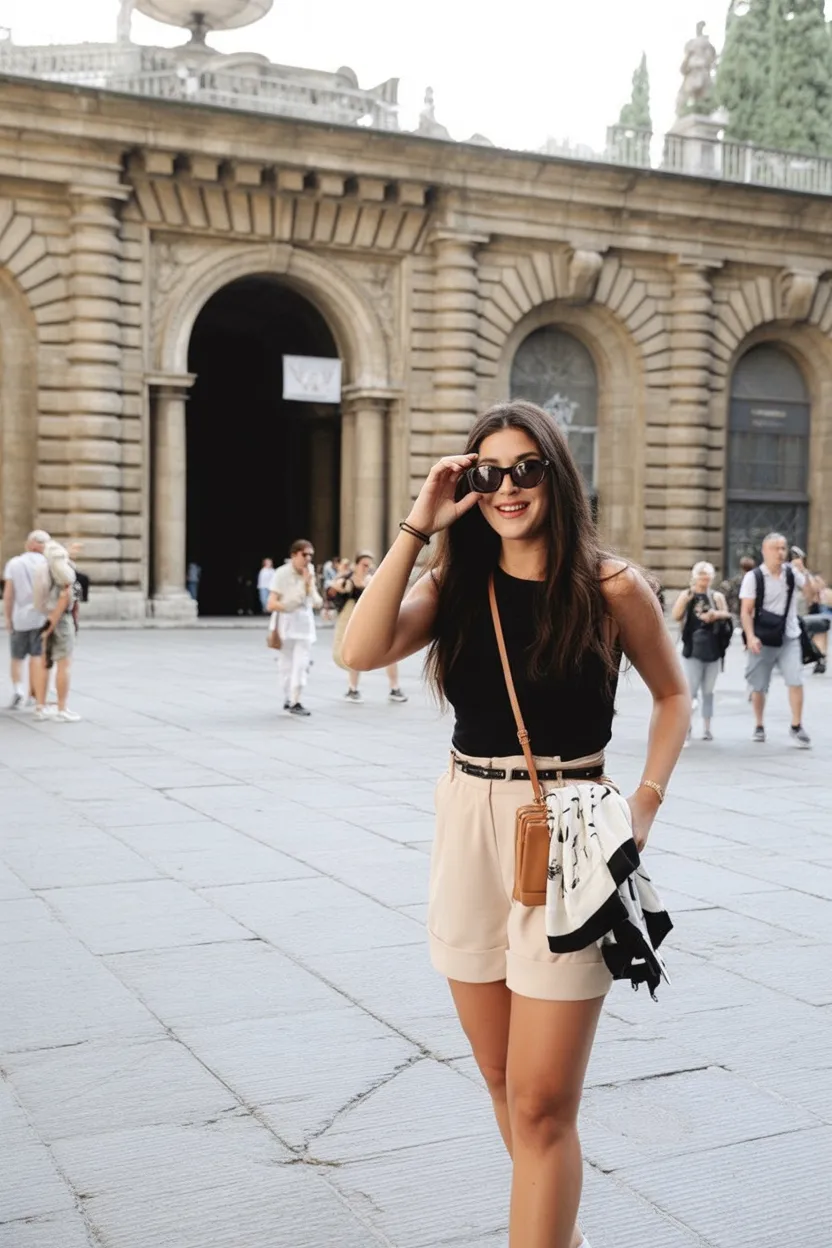 If you’re deciding what to wear on warmer spring afternoons, this look works beautifully. It’s flattering on petite, curvy, and plus-size bodies with small tweaks in fit. Comfortable sneakers make it ideal for Florence or Milan sightseeing days.