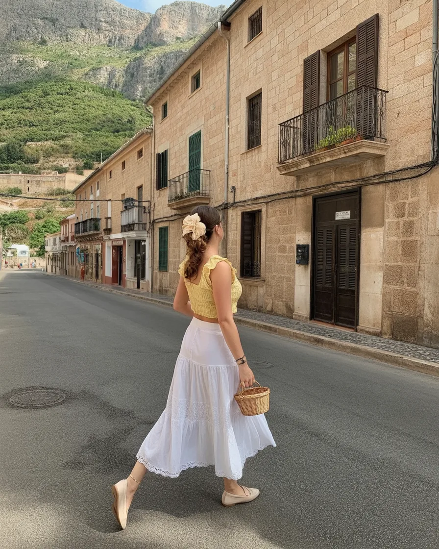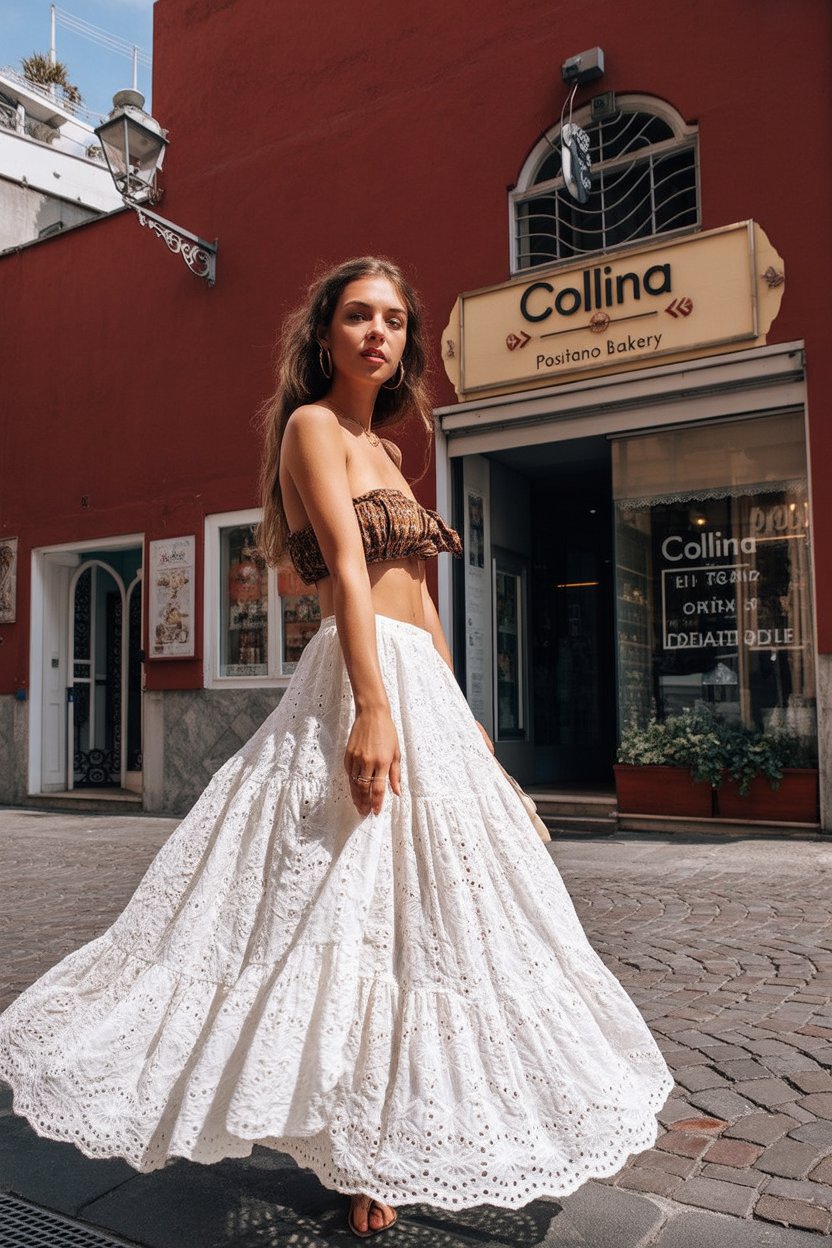 This look feels bold, feminine, and slightly cinematic, like a slow afternoon unfolding somewhere along the Southern coast. The movement of the skirt adds drama without heaviness, creating that relaxed Italian elegance that always turns heads.