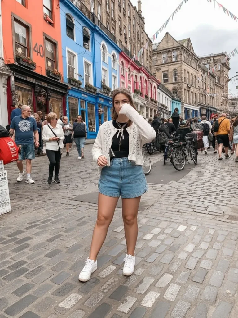 This is a low-maintenance spring look that works for long days on your feet. Denim shorts, light layers, and sneakers make it practical and comfortable for sightseeing.
