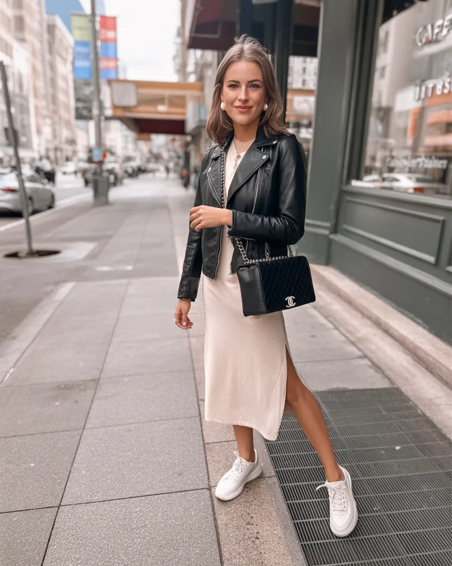 Compared to dressier looks, this one wins for comfort. Paired with sneakers, it’s perfect for bridges and cobblestones. A great inspo outfit for women who want ease without sacrificing style.