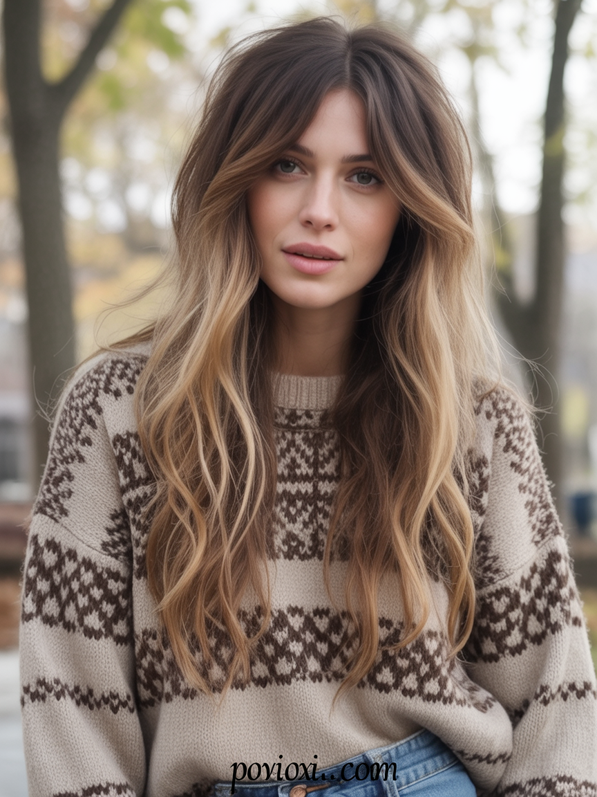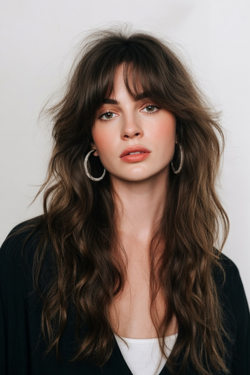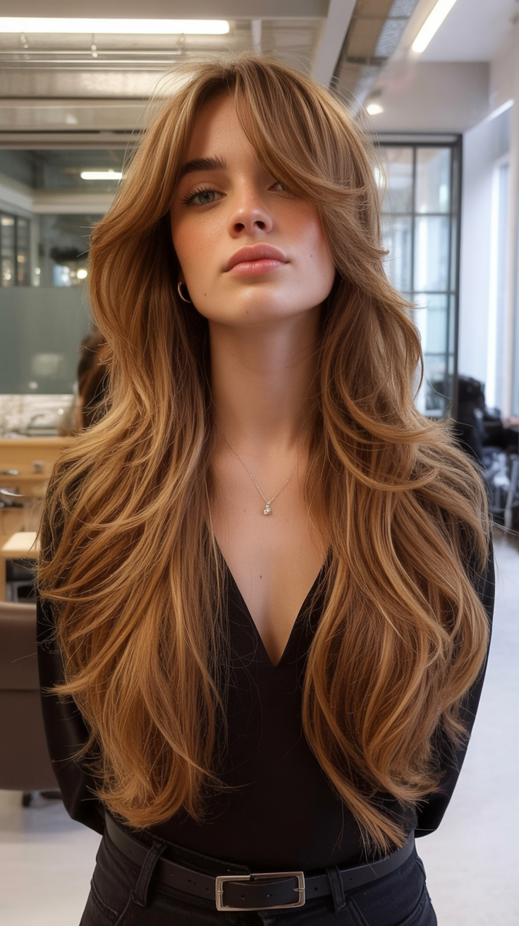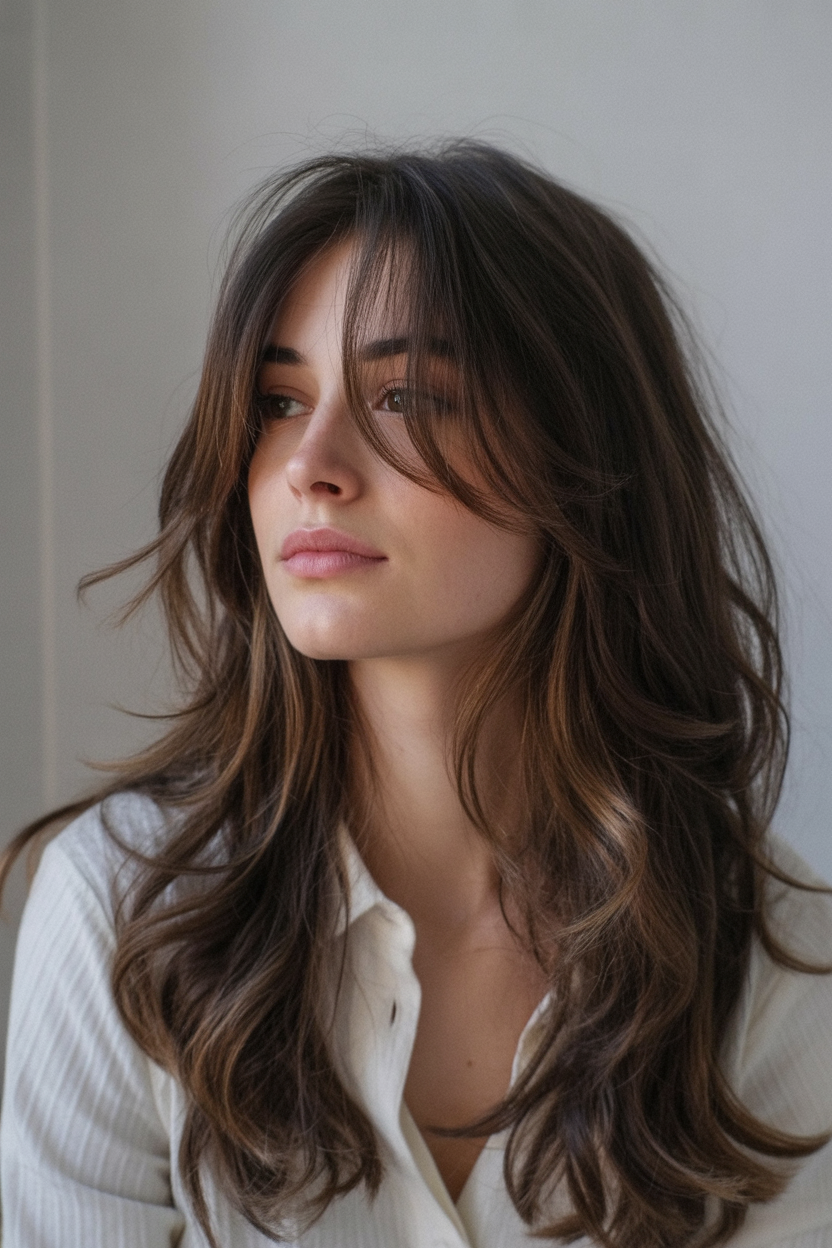 There’s an easy, outdoorsy charm to this style, like you’ve just come back from a weekend away feeling rested and glowing. Long, relaxed waves fall over the shoulders, and the soft face framing draws attention to the eyes and cheekbones. The layered lengths keep everything light and swingy instead of bulky, so even a cozy sweater looks chic rather than weighed down. For women, this kind of movement around the face gives a subtle lifting effect and keeps the overall look youthful without trying too hard.
