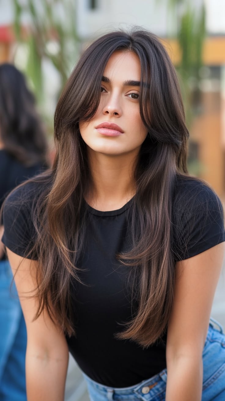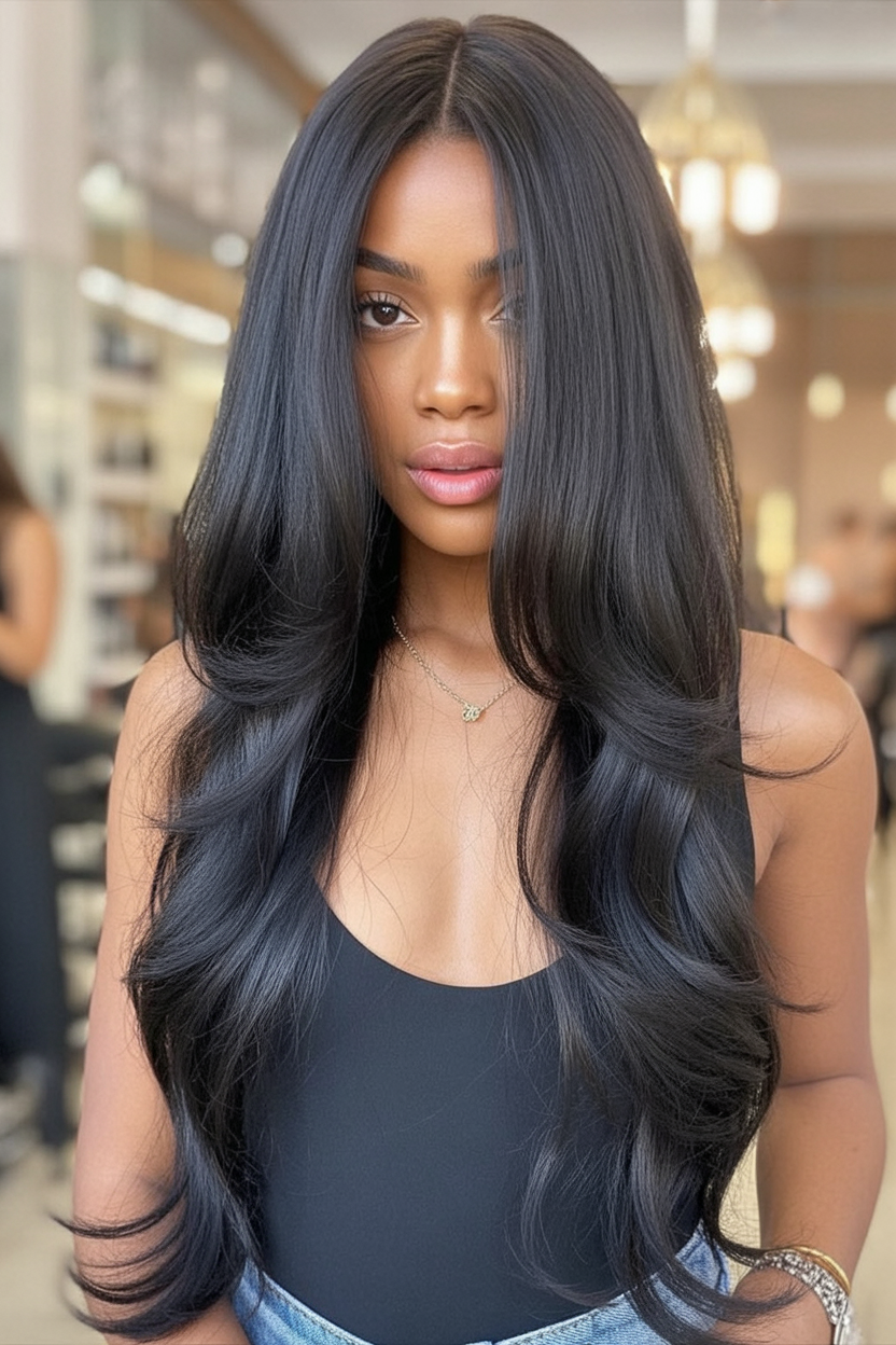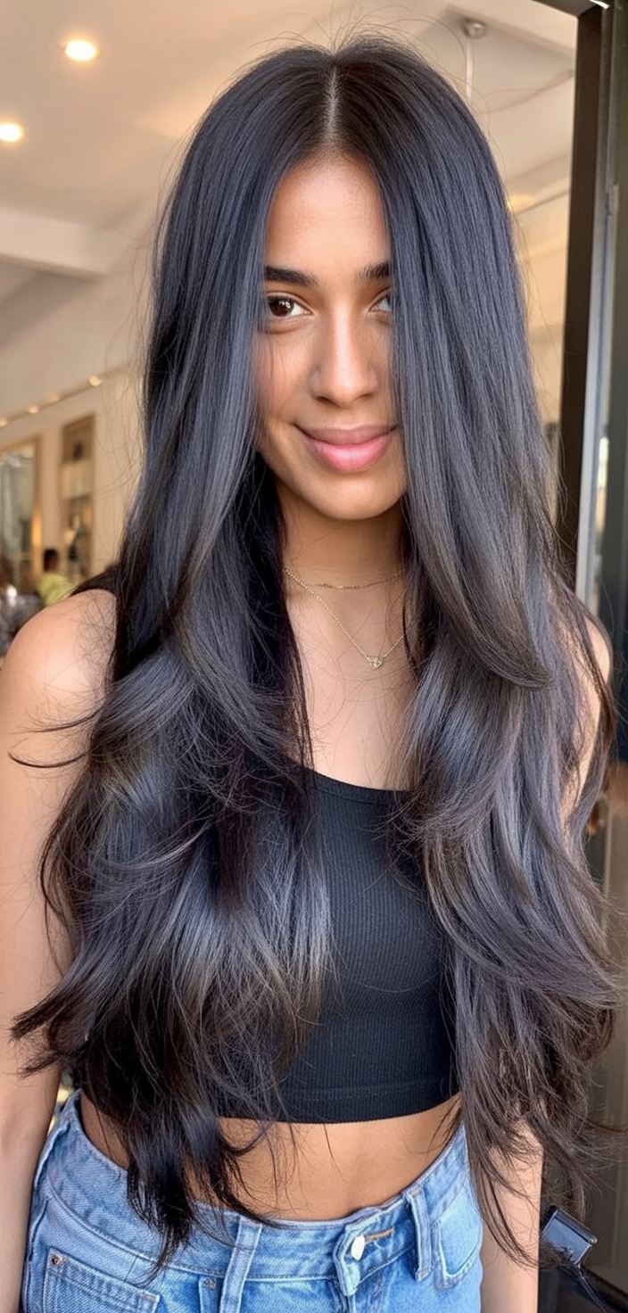 This cut is all about drama in the softest possible way. The hair falls nearly to the waist, but the long layered haircuts keep it from feeling heavy or overpowering. The center part opens the face and lets those sleek, polished lengths frame the cheeks like a curtain, so the focus stays on your eyes and smile. On a woman, that glossy sheet of hair reads intentional and modern, not “I just never cut it.” It gives you that quietly luxurious vibe, like a great cashmere sweater and a favorite gold necklace.
