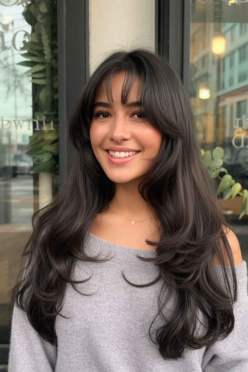 Just look how this look has that quiet confidence that whispers rather than shouts its way to attention but draws it irresistibly anyway. The hair sweeps effortlessly down over the shoulders with every movement, and the curtain bangs soften the entire face to fall invitingly across the cheeks. The layers are subtle and unchoppy enough to distinguish the look fully without disrupting the look fully; instead, there’s an impressive sleeking that seems almost like wearing a bespoke jacket to just be your hair. This look of long hair will immediately be fresh and planned rather than something that’s simply “grown out.”