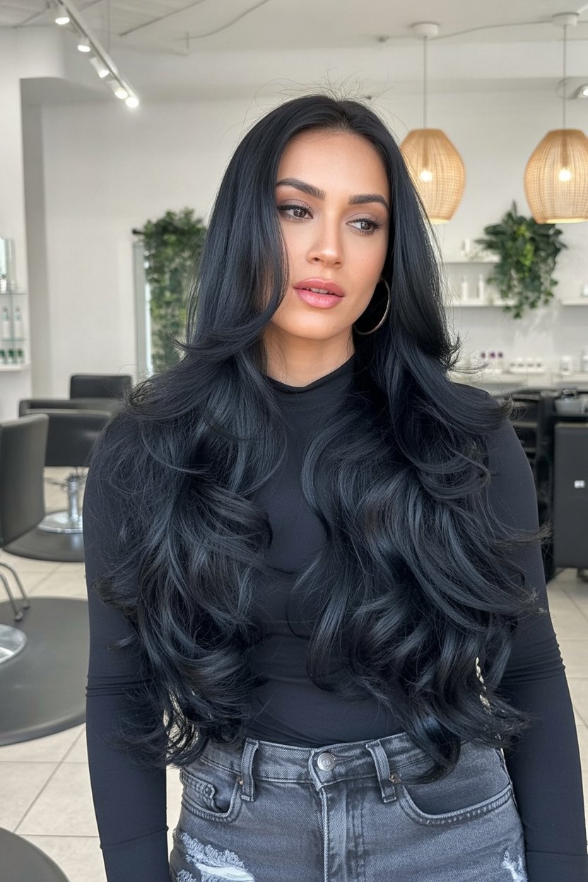 15. Jet-Black Long Layers for Thick Hair