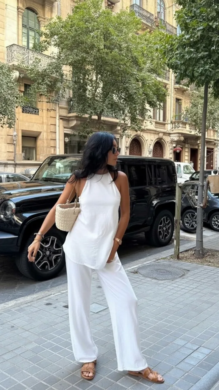 There’s something so undeniably polished about an all-white outfit in summer. It looks clean, modern, and quietly expensive, even when the pieces themselves are wonderfully simple. This sleeveless tunic-and-pants combination has that sleek, effortless mood that makes you look instantly pulled together, like you just know what works for you. In the world of modest summer outfits in 2026, this kind of minimalist dressing feels especially relevant because it delivers coverage, comfort, and style without any visual clutter. It’s a little bit resort, a little bit city-cool, and entirely the kind of outfit that makes women feel refreshed the second they put it on.