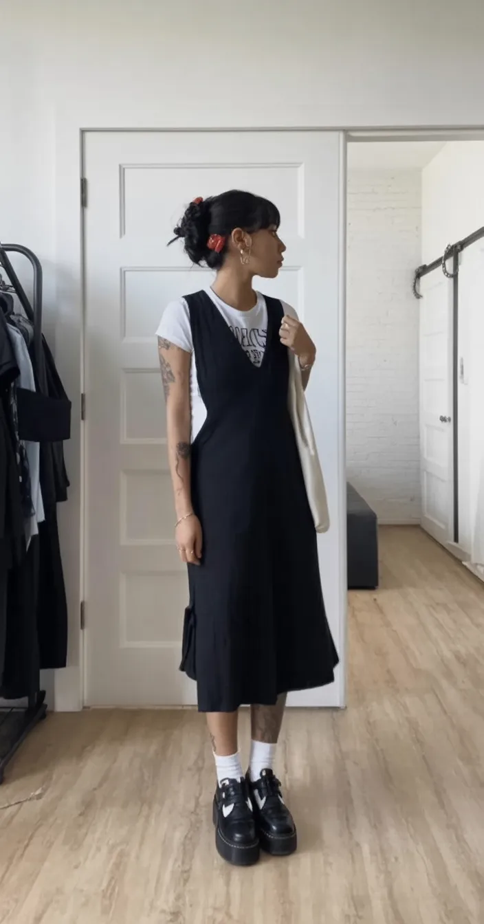 This would be such a fun option for university days, gallery visits, coffee dates, or any casual setting where you want personality without sacrificing ease. Compared with a basic midi dress, this layered style feels more intentional and more fashion-forward, especially if you like mixing feminine pieces with chunkier shoes or a tote bag. It’s also a smart choice for women who prefer arm coverage through layering instead of extra fabric in the main dress. If your style leans more black, minimal, and slightly offbeat, this is the kind of Inspo that keeps summer outfits feeling true to you.