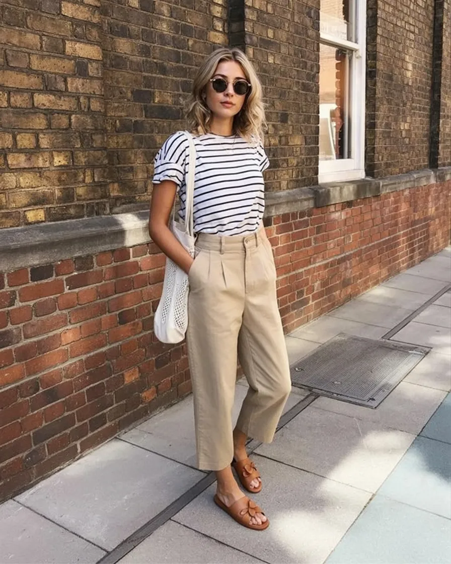 This is one of those outfits that proves modest style doesn’t have to be complicated to feel sharp. A striped tee with tailored cropped Pants has such a clean, smart energy, like the kind of look you reach for when you want to feel capable and stylish at the same time. It’s classic, yes, but not boring. The structured trousers give it polish, while the tee keeps it grounded and easy. In modest summer outfits in 2026, this kind of balance is everything. It feels practical for real life, but it still has that cool, slightly European feel that makes it stand out in the best way.