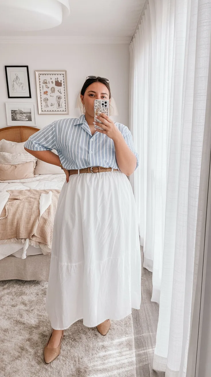This is the kind of outfit that makes you stand a little taller. A crisp striped shirt tucked into a full white skirt has such a clean, confident feel, and yet it still feels soft enough for summer. It gives off that “I know what suits me” energy that so many women are craving right now. There’s a freshness to it that feels mature, stylish, and easy all at once, which is why it fits so naturally into modest summer outfits in 2026. It’s not flashy, but it absolutely gets noticed. That balance of polish and ease is what makes it such good Inspo for everyday dressing.