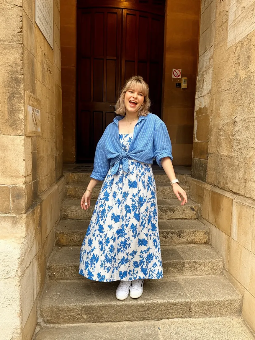 2. Blue Floral Maxi with a Relaxed Shirt Layer