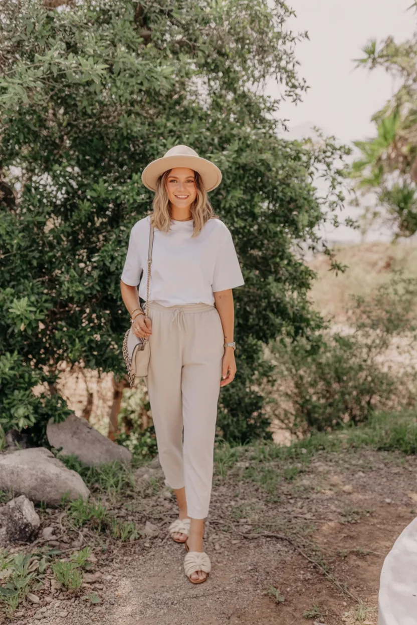 From a low-maintenance point of view, this is hard to beat. The relaxed Pants and roomy tee are perfect for hot weather, travel days, errands, or any moment when you need comfort but still want to look polished. It’s especially great for women who prefer no-fuss dressing and want something that can be elevated with just a hat, crossbody bag, or simple jewelry. It may look minimal, but the emotional payoff is real—this is the kind of outfit that lets you breathe, move, and still feel stylish, which is honestly a little luxury in itself.